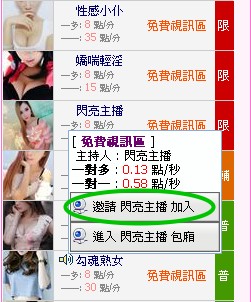 5.在你喜歡的主持人框中按滑鼠左鍵,選擇 邀請 xxx主播 加入,觀看主持人免費視訊及聊天